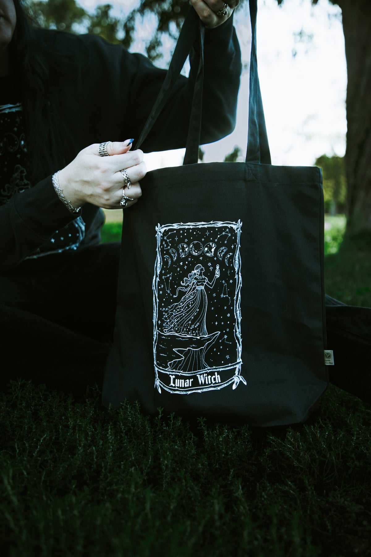 Under the hush of moonlight, you carry more than just your essentials you carry your story. The Lunar Witch Tote Bag is made for those who read the phases of their soul, dance between midnight pages and record spins, and listen to the whispers of the lunar tide. Crafted from sturdy organic cotton, it’s equal parts ritual vessel and everyday companion.