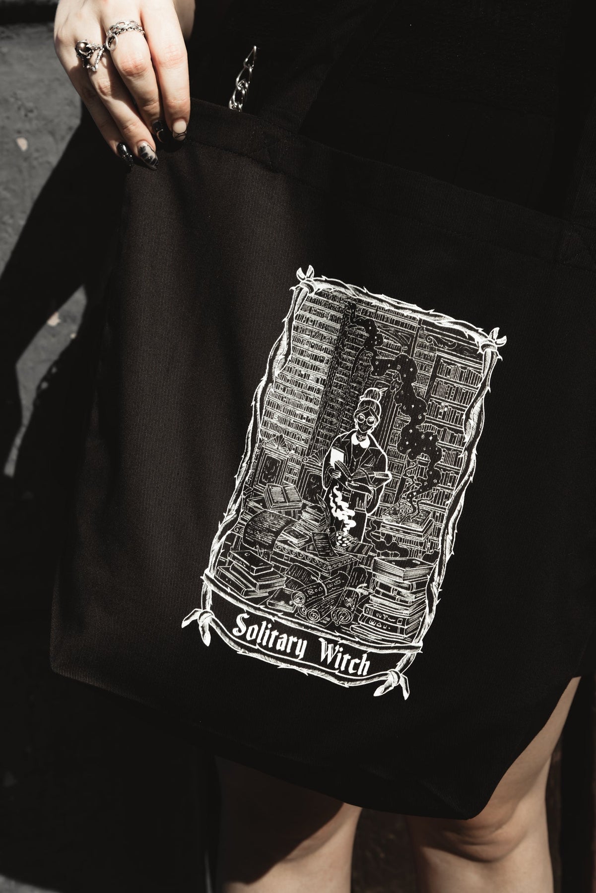 For the witch whose best friends are ink, paper, and moonlit whispers. The Solitary Witch Tote Bag is your silent library companion, your book-haul vessel, your everyday ritual in canvas form. It’s designed for cozy corners, midnight readings, and city strolls with a hard-cover in one hand and your thoughts in the other.