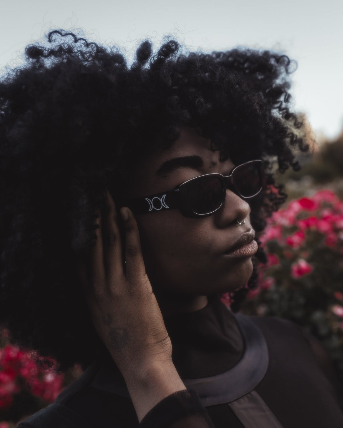 Shiny black triple moon sunglasses, subtle but also extra af.