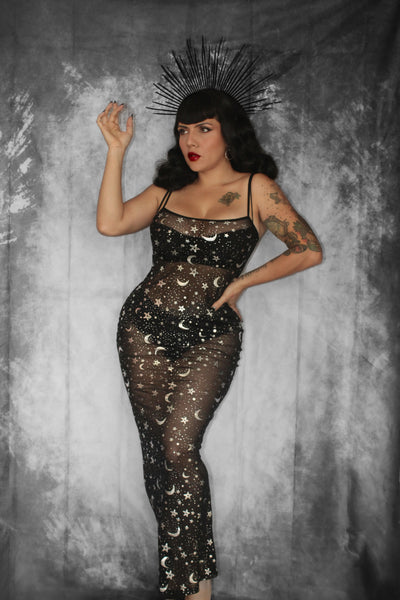 Sheer Hourglass Maxi Dress - Metallic Moon & Stars - READY to SHIP