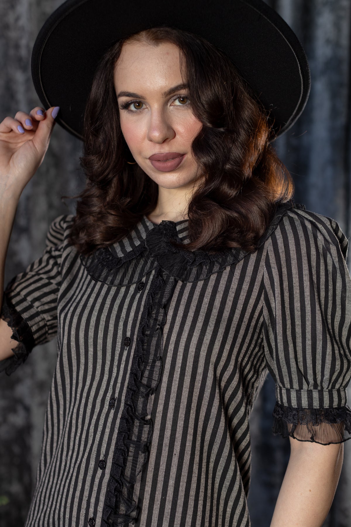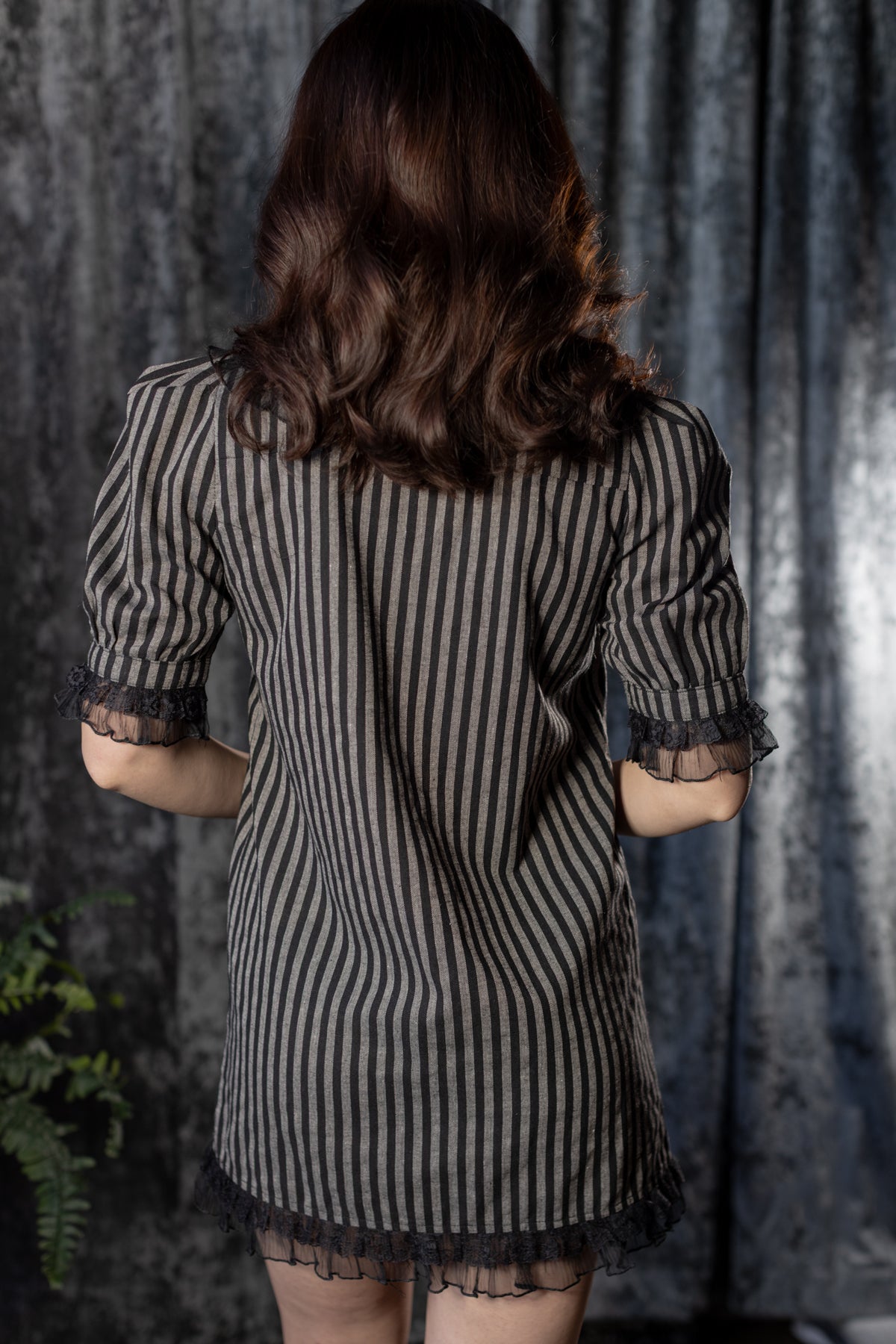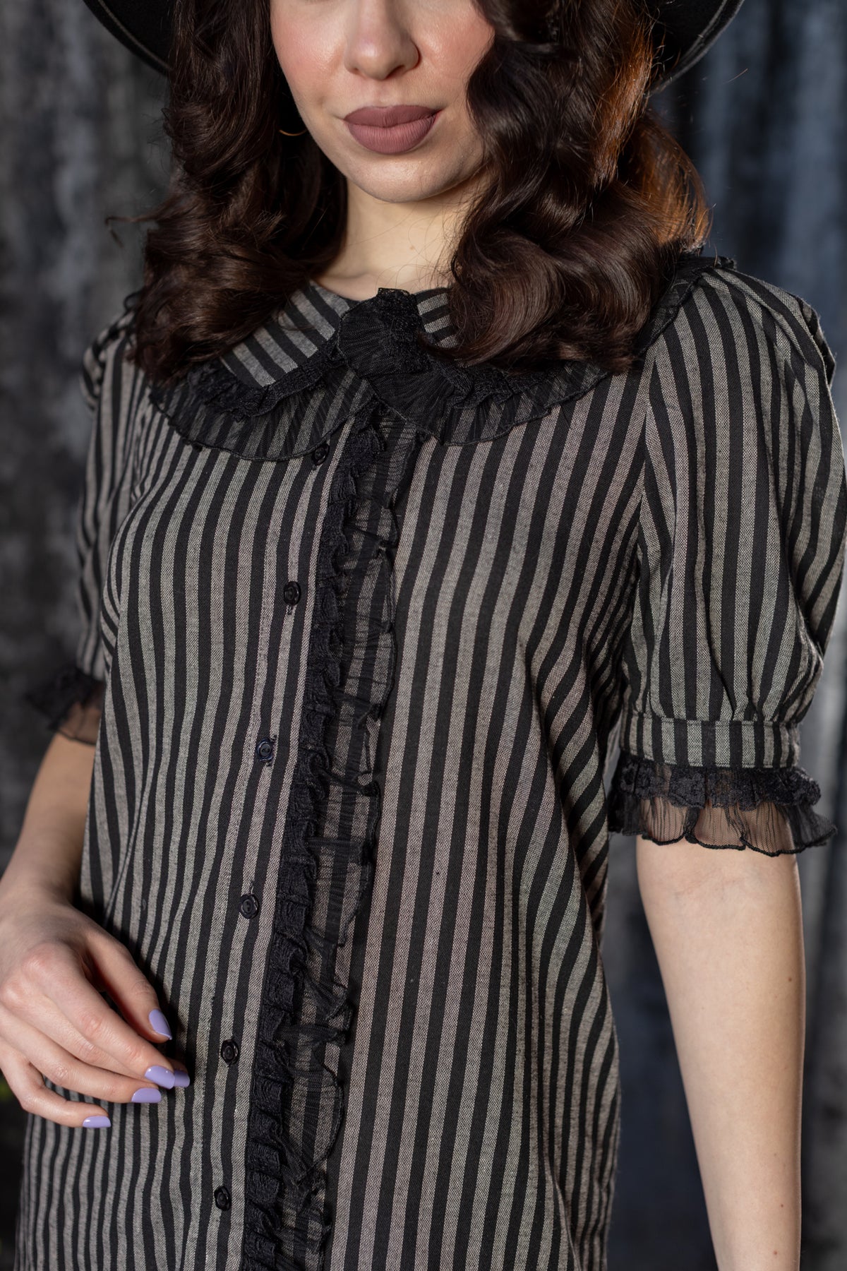 Vertical gothic stripes elongate the form, while ruffled edges add a Victorian sweetness, but yet just slightly off. The button-down front keeps it classic, while the mini length makes it modern, playful and a little dangerous. Comfortable, lightweight and deceptively sweet, this is the kind of dress that looks like it might move on its own when you’re not watching.