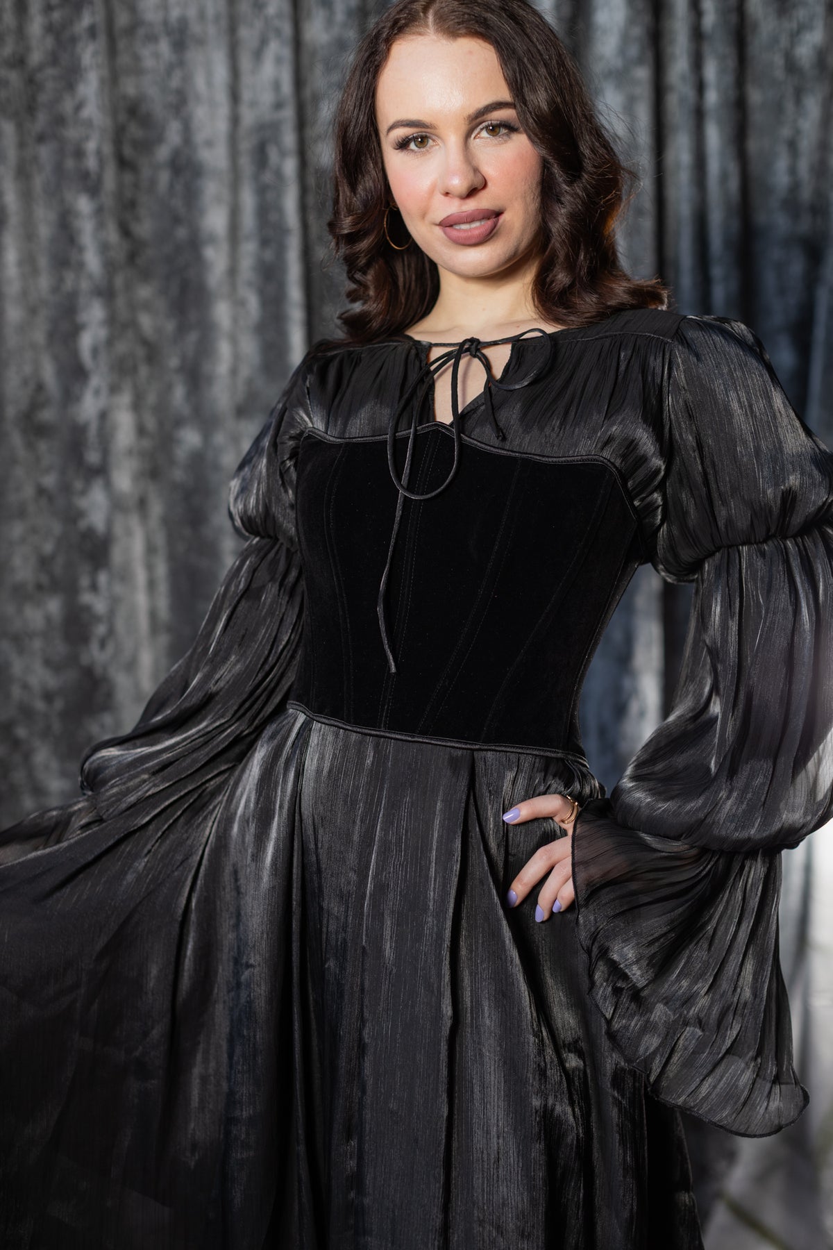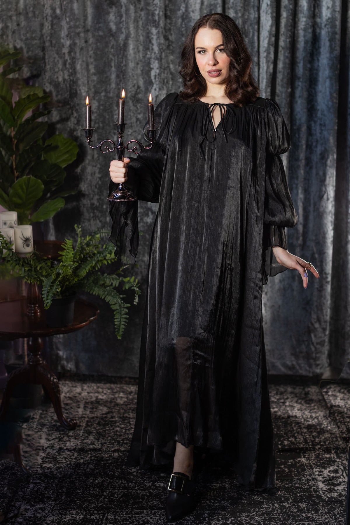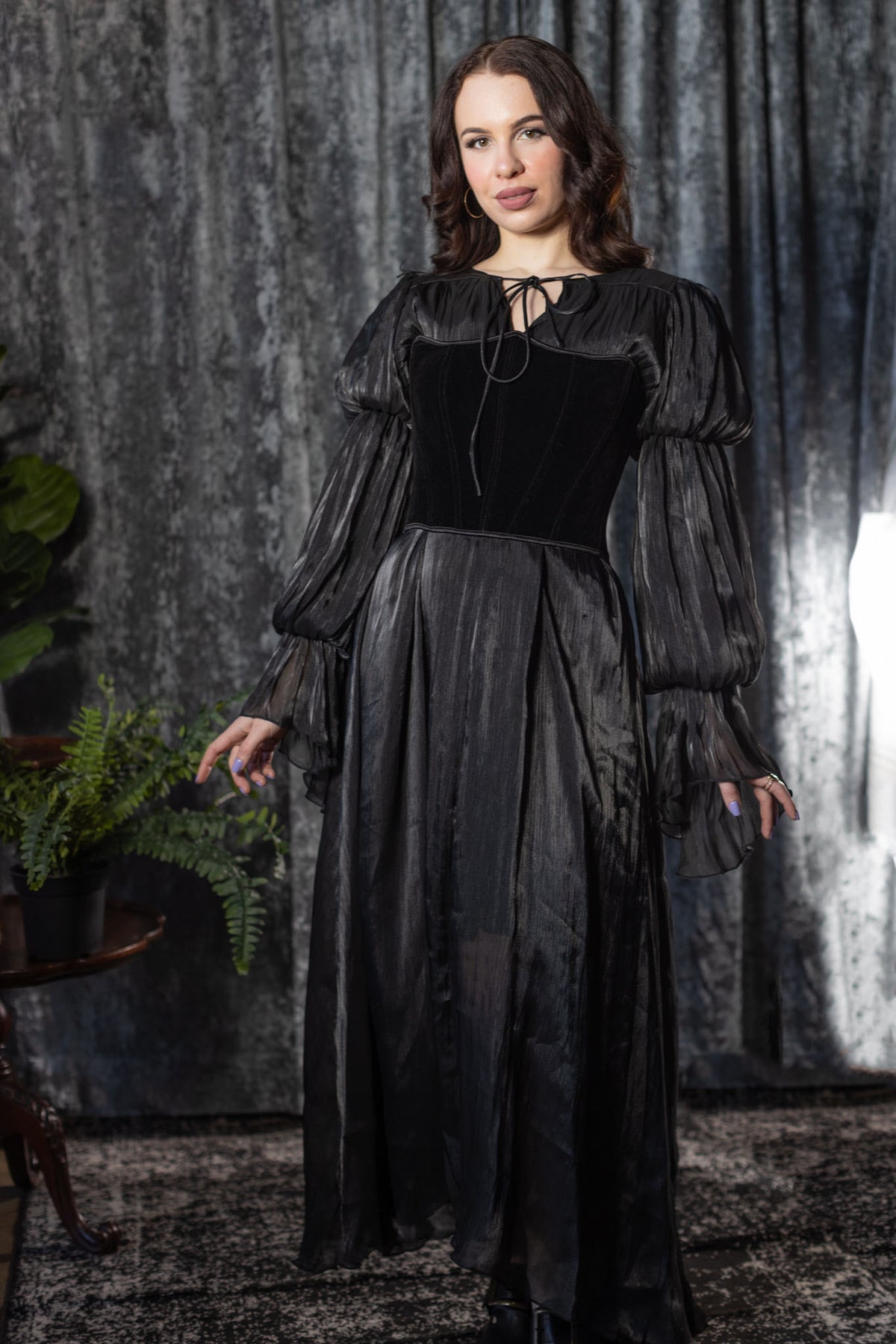 Designed to be worn alone or layered, it moves beautifully under a corset or harness. The subtle sheen adds depth without overpowering, making it perfect for day-to-night drama or ritual-level styling. Romantic, spectral and unapologetically dark, this dress belongs to modern vampires and old souls alike.