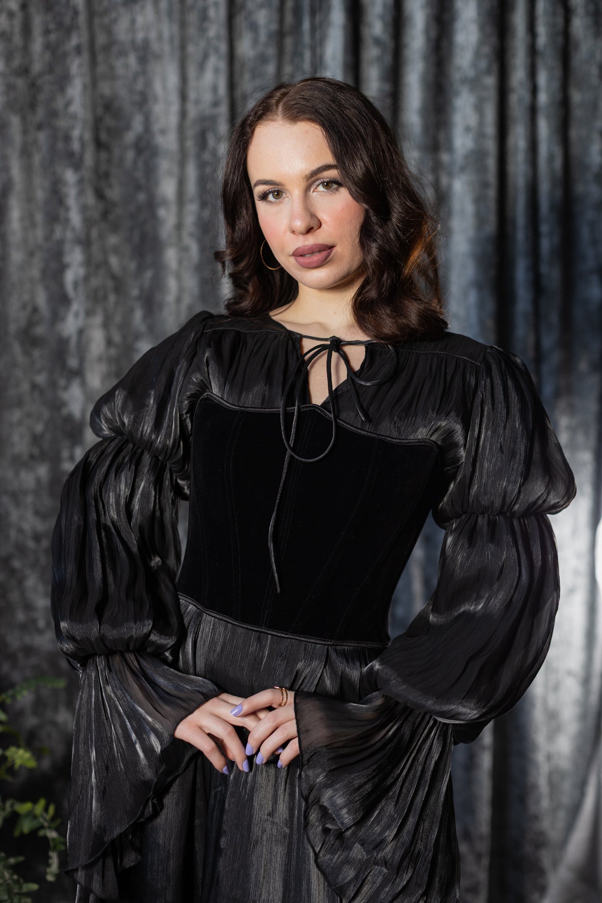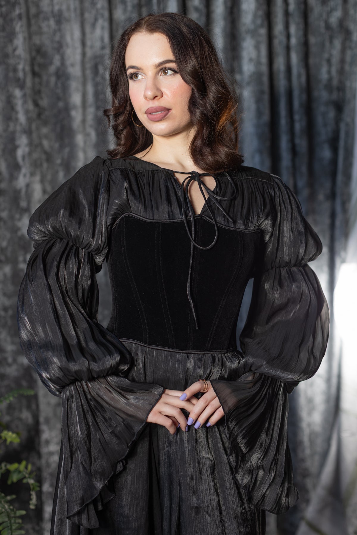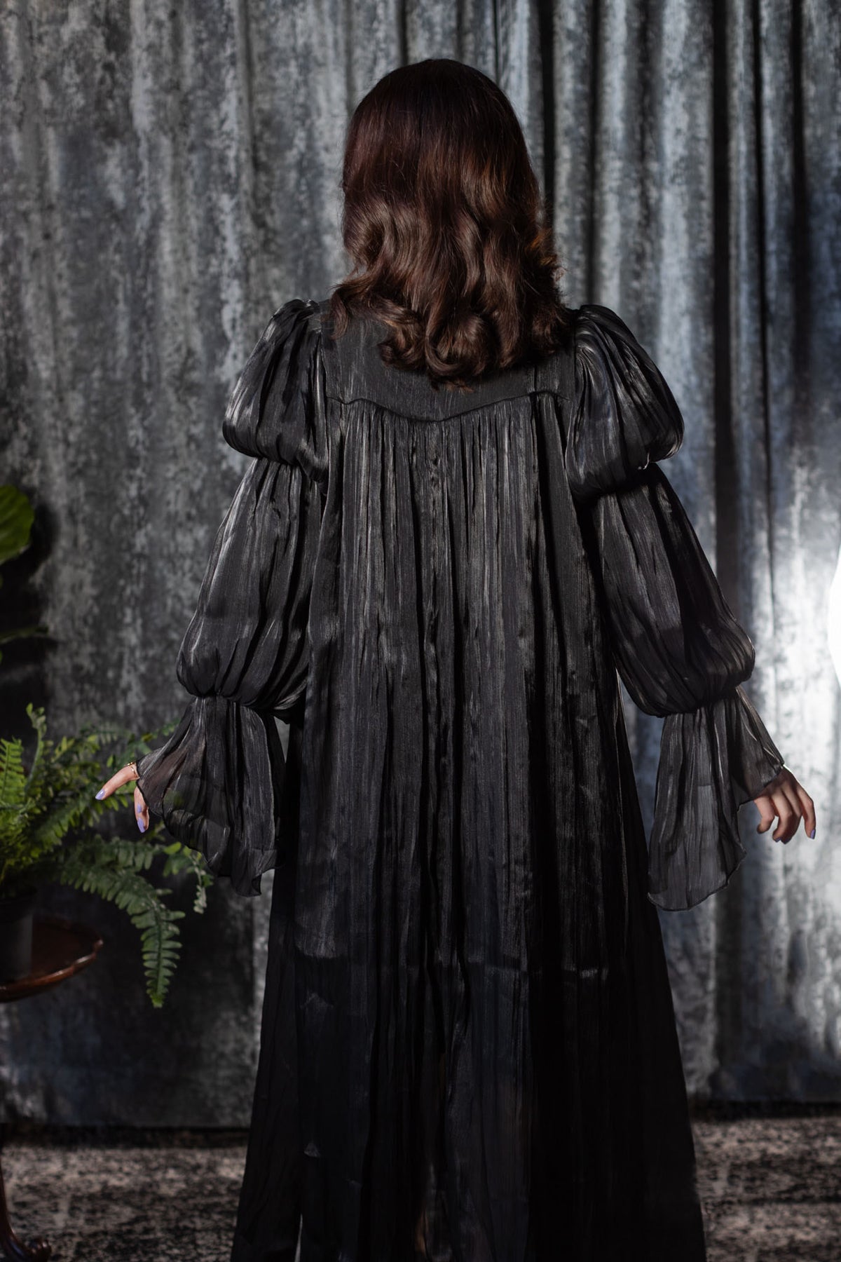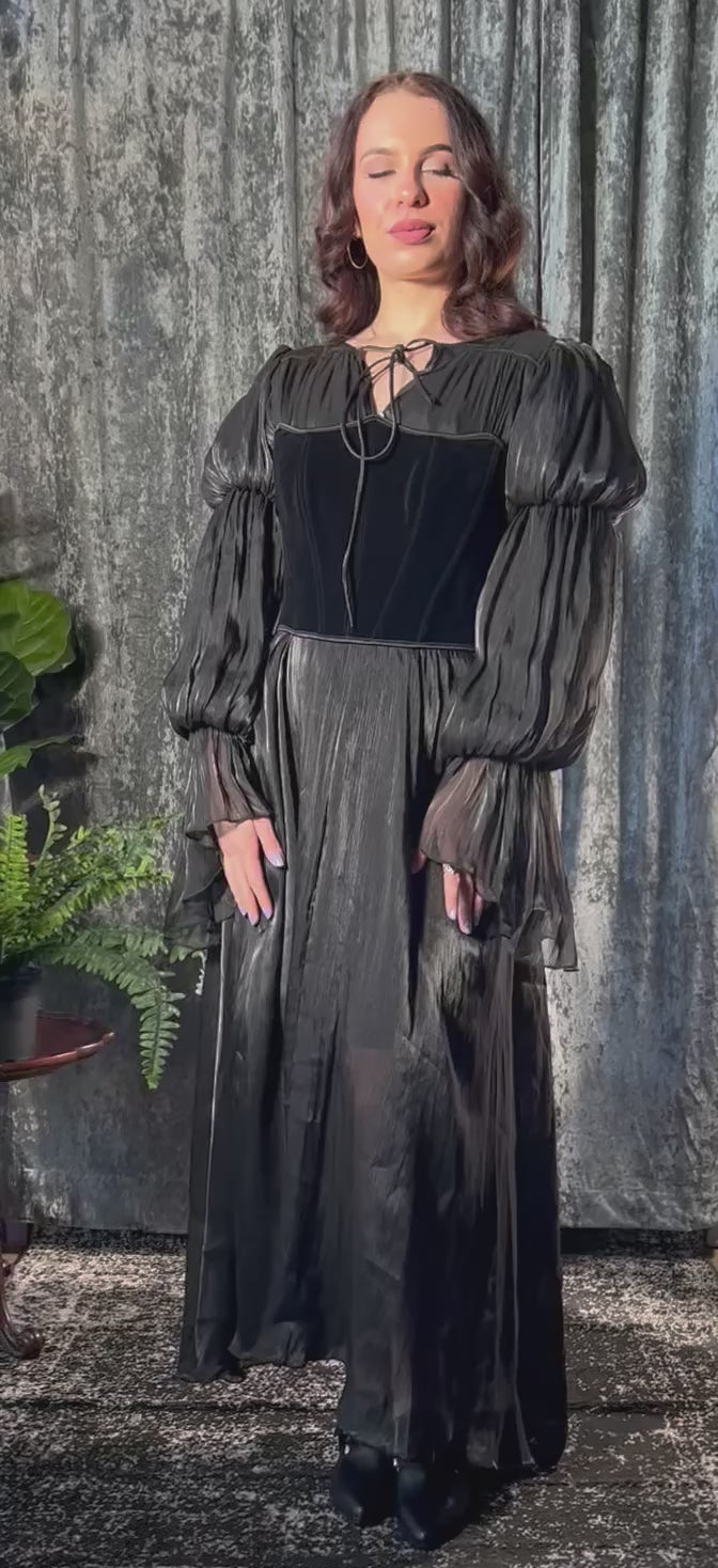 The Edith is dress pulled straight from a moonlit gothic romance. Crafted from metallic black, fluid fabric that catches the light like a whispered secret, this piece drapes effortlessly with an eerie, elegant flow. The silhouette feels timeless yet undone, while simultaneously evoking Victorian hauntings, candlelit corridors and velvet-dark nights.