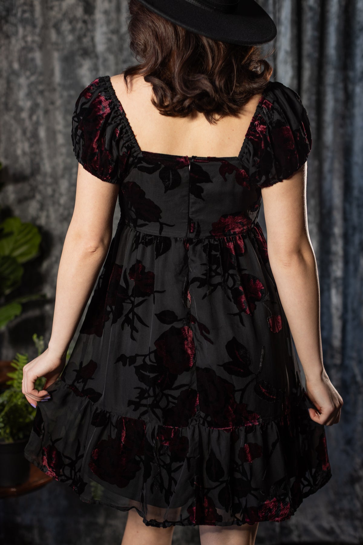The Reagan dress is a babydoll dress with a dark heart. Made from custom velvet flocked crimson floral mesh, this piece floats effortlessly with soft movement and quiet drama. The mesh is adorned with lush velvet blooms, creating rich texture against the skin while remaining lightweight and breathable.