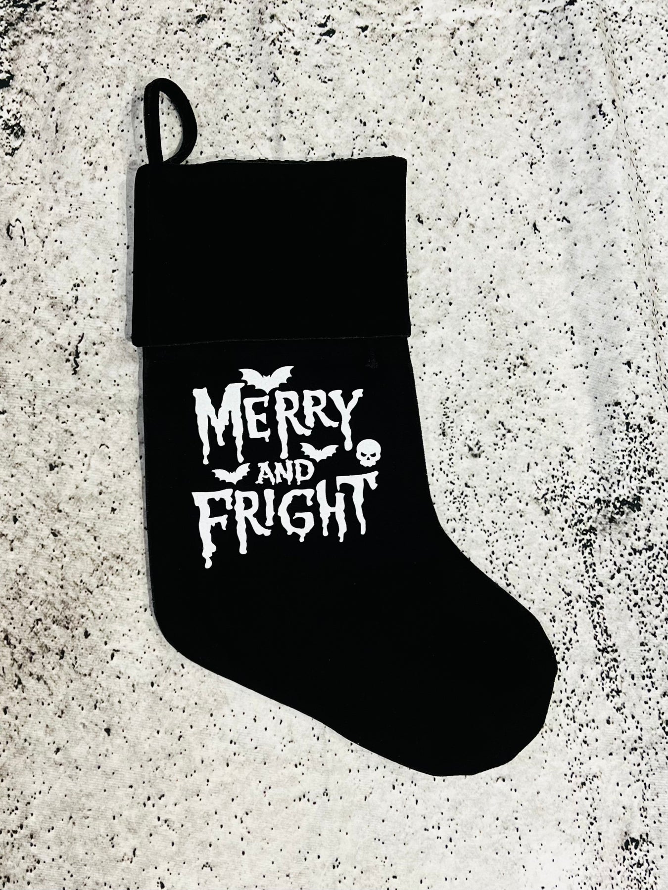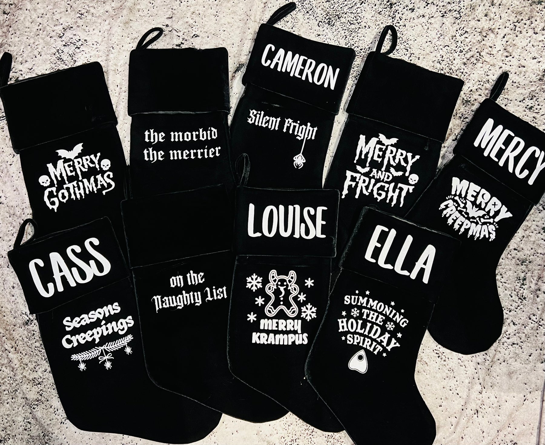 Let's do the holidays, but spooky! Welcome to the first item in our brand new holiday collection! Each stocking is made from plush black velvet and is a great large size to fit every little treat! Each has a loop to attach to a mantle or wall.