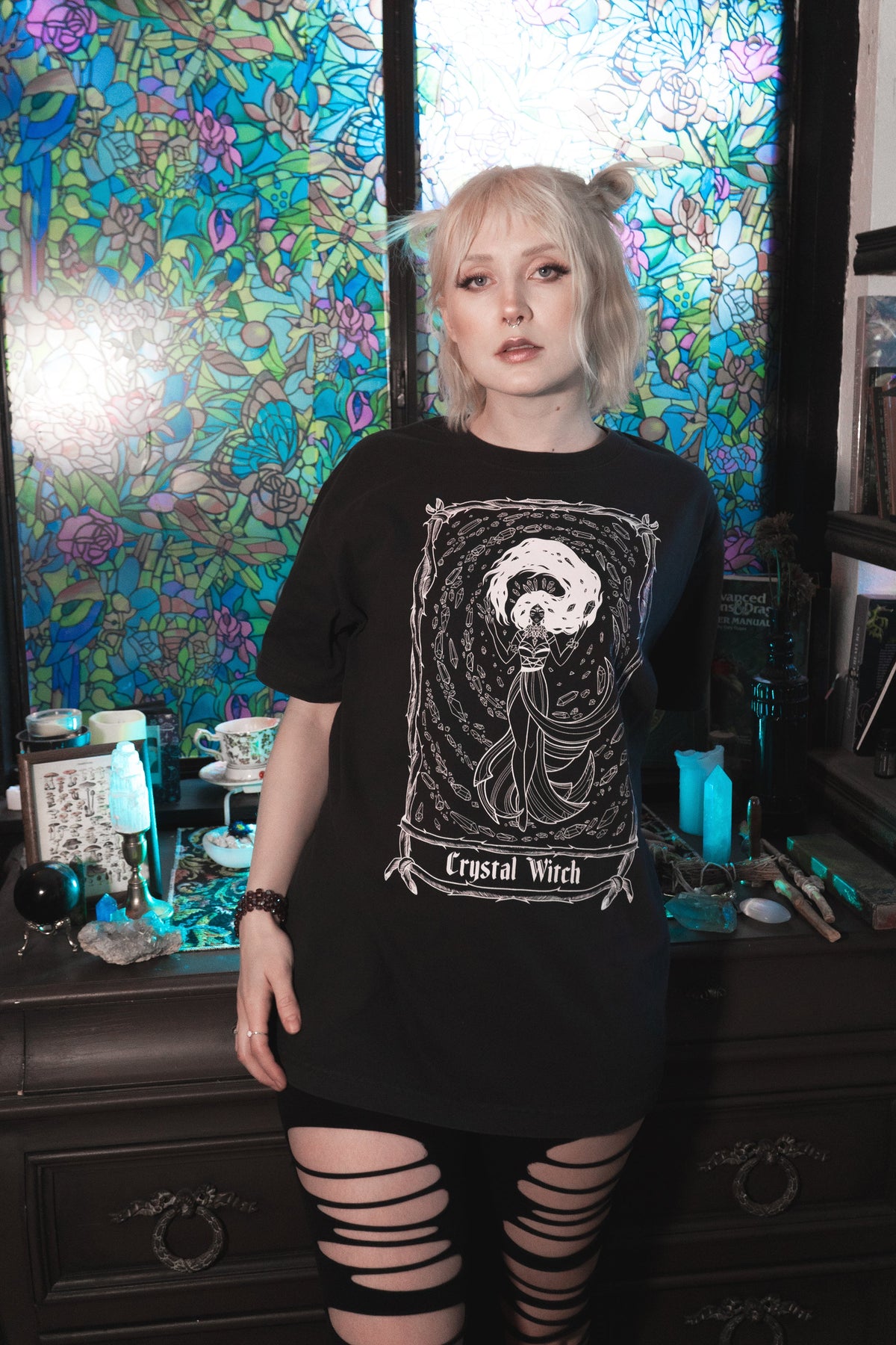The Crystal Witch Tee is a soft, heavyweight graphic tee designed for everyday wear with a true oversized fit and a worn-in feel. Made from 100% ring-spun cotton in a 6.5 oz heavyweight fabric, it has a more substantial drape than a standard tee comfortable, breathable, and built to hold its shape while still feeling easy.