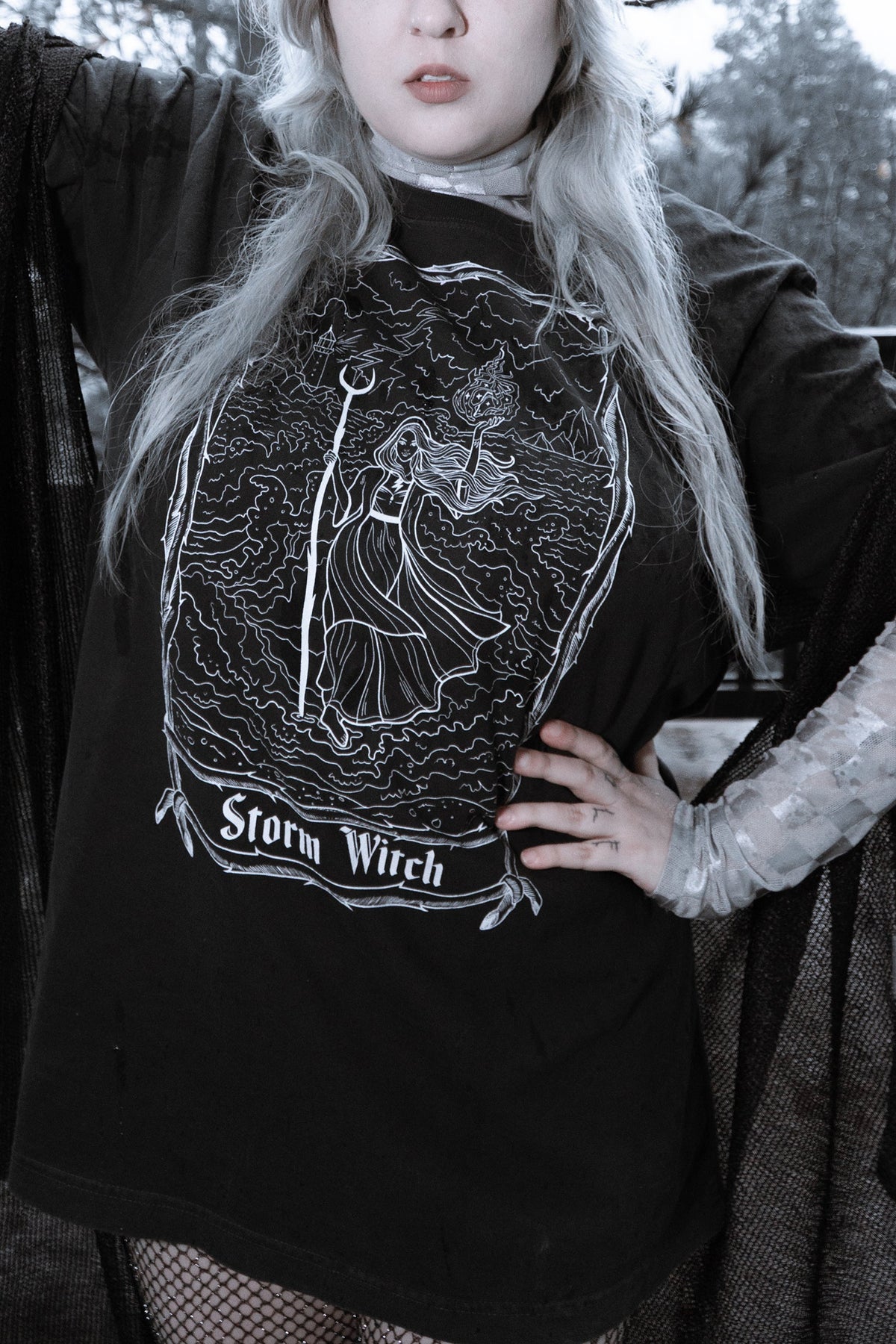 The Storm Witch Tee is an easy, everyday tee with a relaxed fit and worn-in feel. Made from soft 100% cotton, it’s comfortable, breathable, and designed for repeat wear. Inspired by the Storm Witch a figure of change, resilience, and quiet power, this tee is made for those who move through chaos without needing to announce it. Easy to style on its own or layered, it fits seamlessly into a dark, everyday wardrobe.