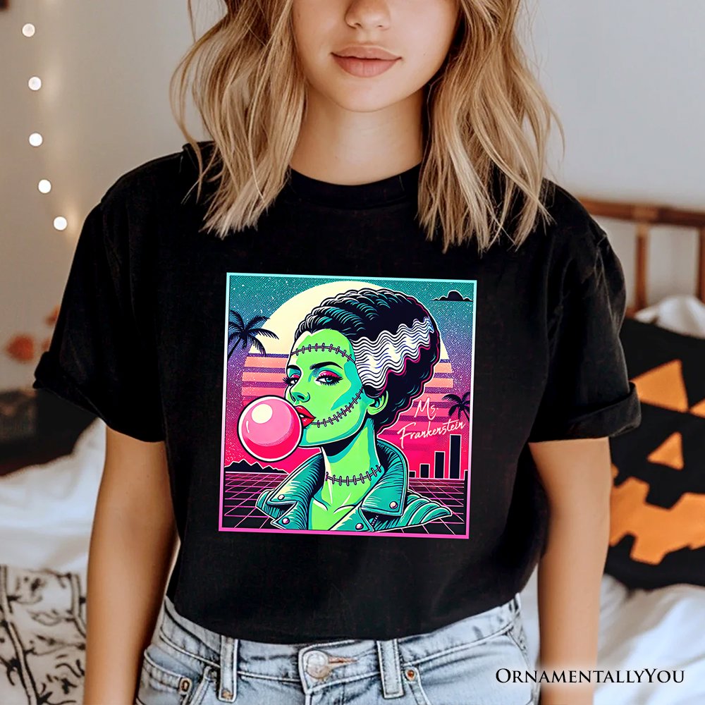 Step into a neon-lit nightmare with this retro horror graphic tee, inspired by synthwave aesthetics and classic 80s monster flicks. Featuring a bold, electrifying design of Mrs. Frankenstein in striking vaporwave colors, this t-shirt is a must-have for horror fans, goth lovers, and Halloween trendsetters. Perfect for spooky parties, haunted house adventures, or just turning heads all October long, the soft unisex fit ensures comfort while keeping your creepy-cool style on point. ⚡🧟♀️🎃 Whether you're into horrorcore fashion or love nostalgic sci-fi vibes, this shirt screams vintage horror with a modern twist.