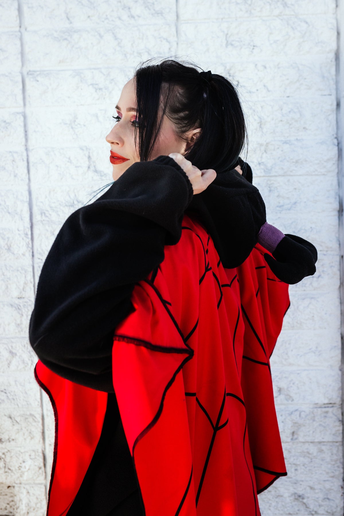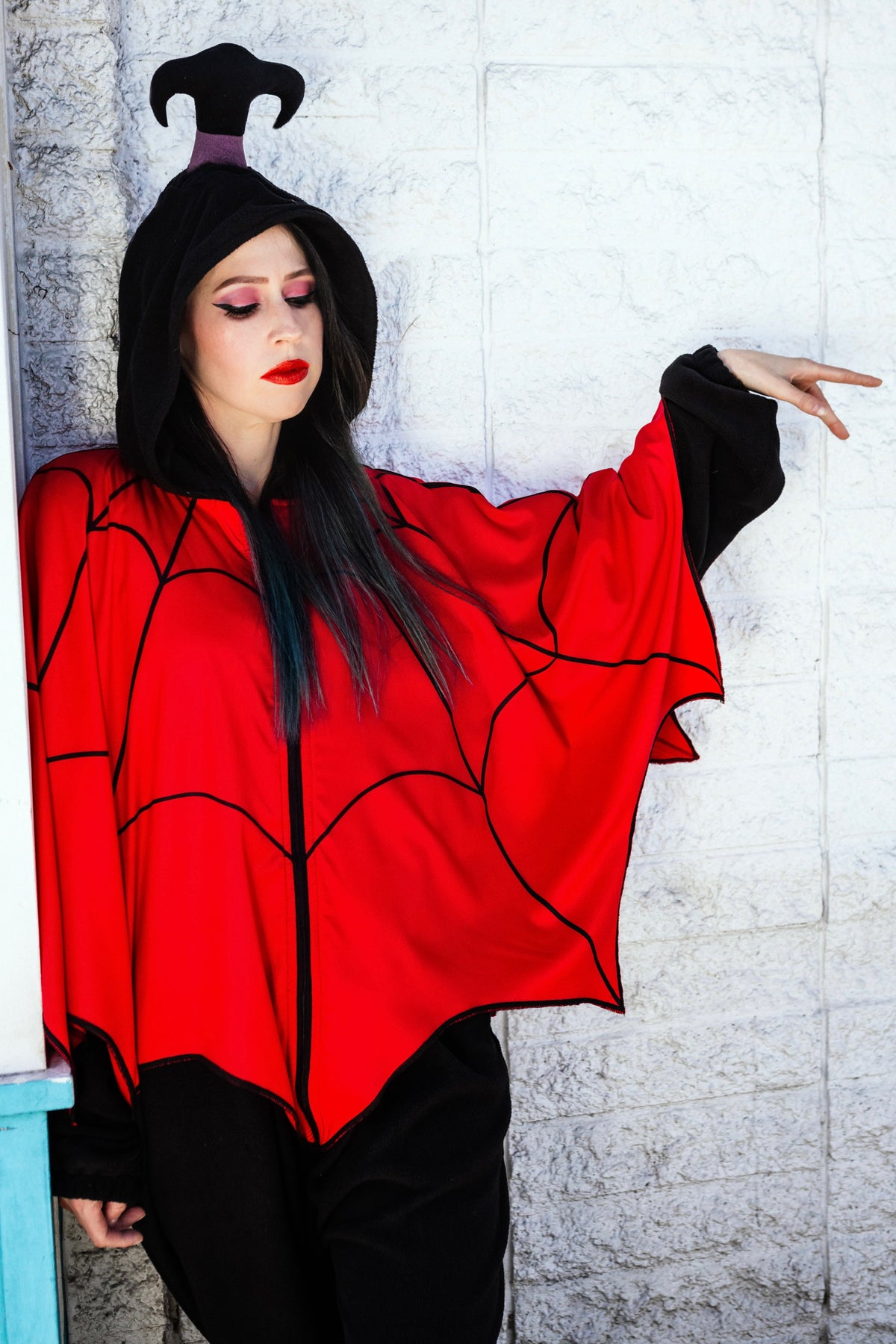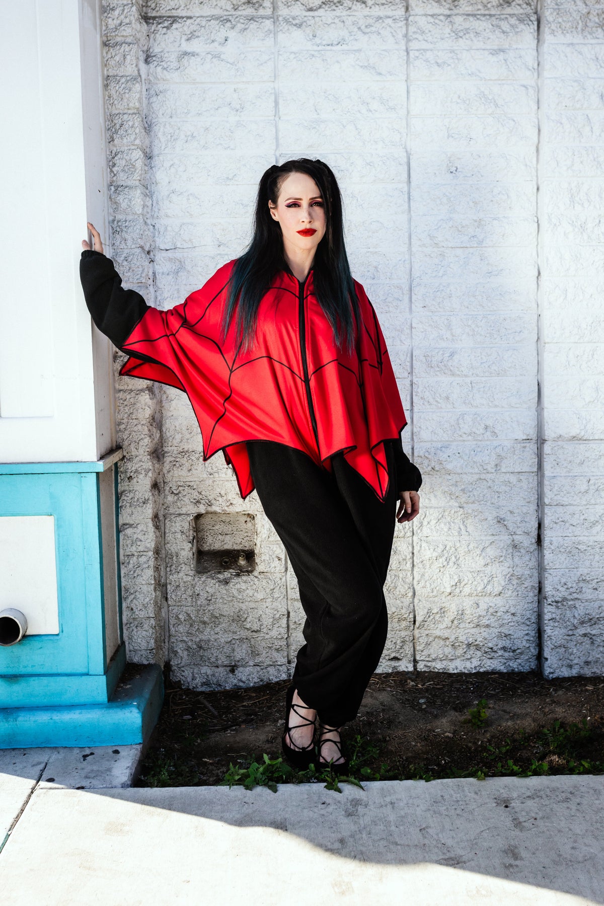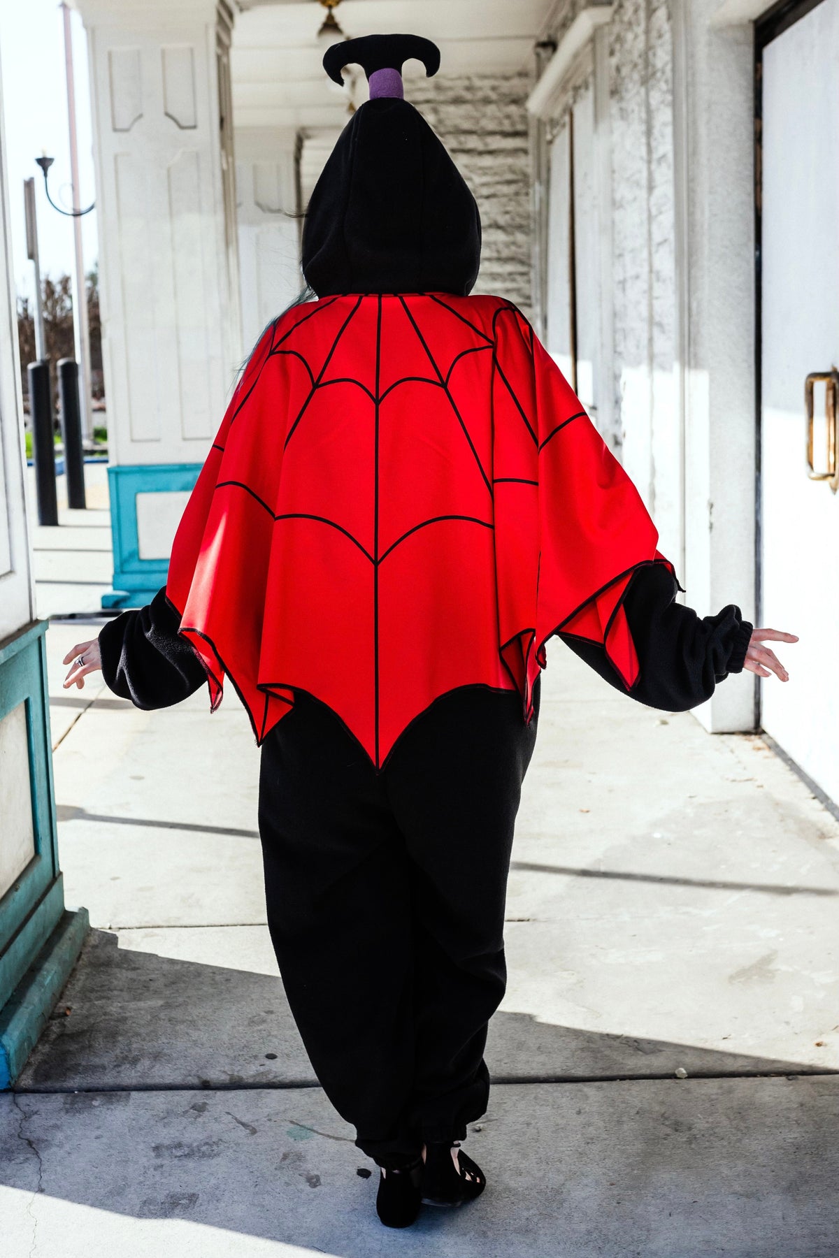 The standout feature of this onesie is the eye-catching, red spiderweb poncho, made from high-quality polyester. This adds a vibrant contrast to the black body, and captures Lydia's distinctive style. The body of the onesie is designed with practicality in mind, featuring a chunky, black plastic zipper and pockets that aare all cleverly concealed to maintain the sleek aesthetic.