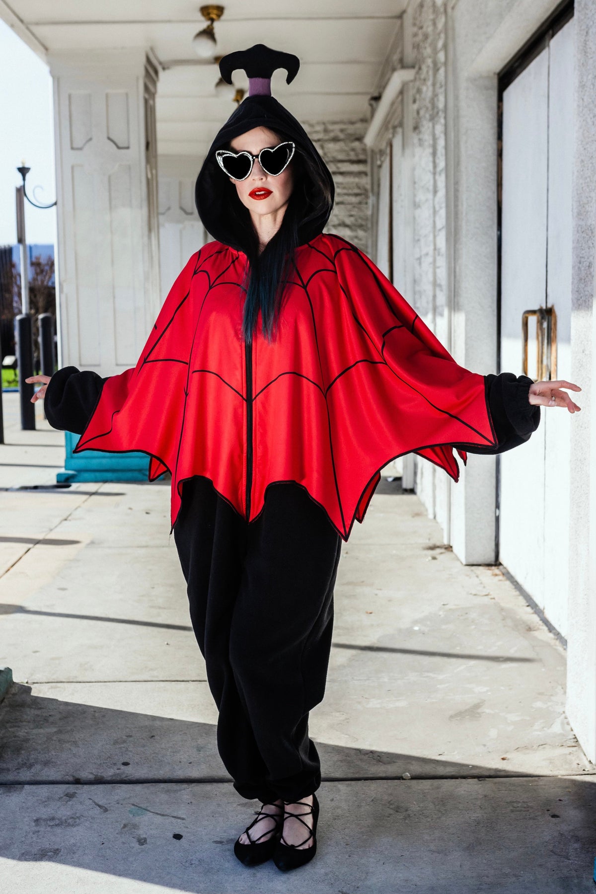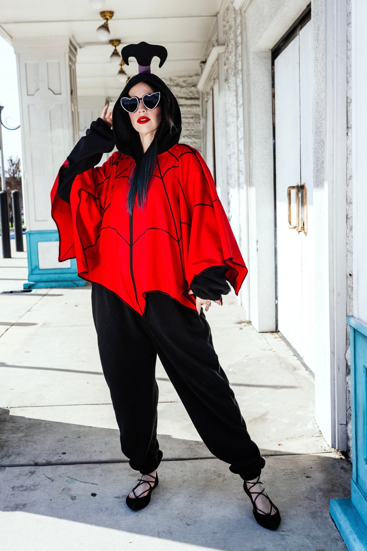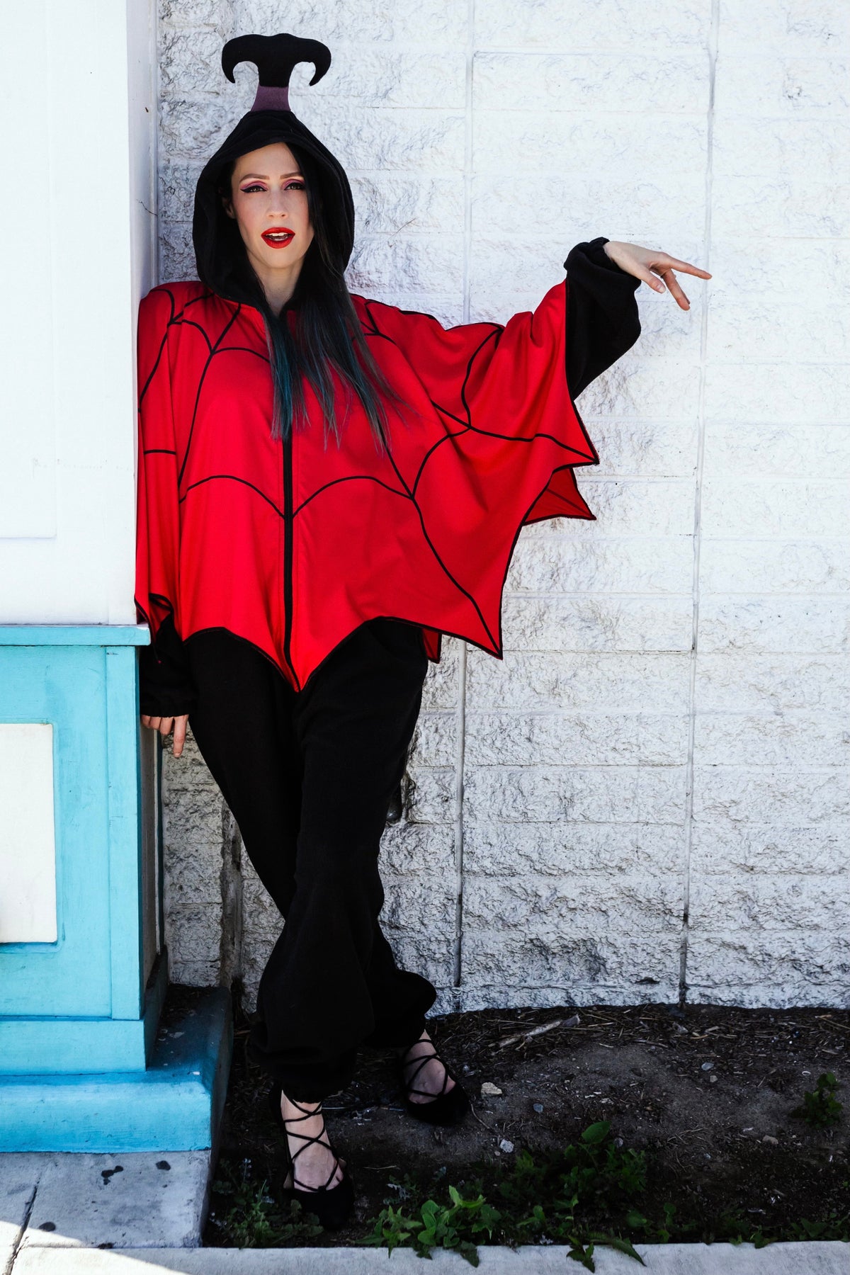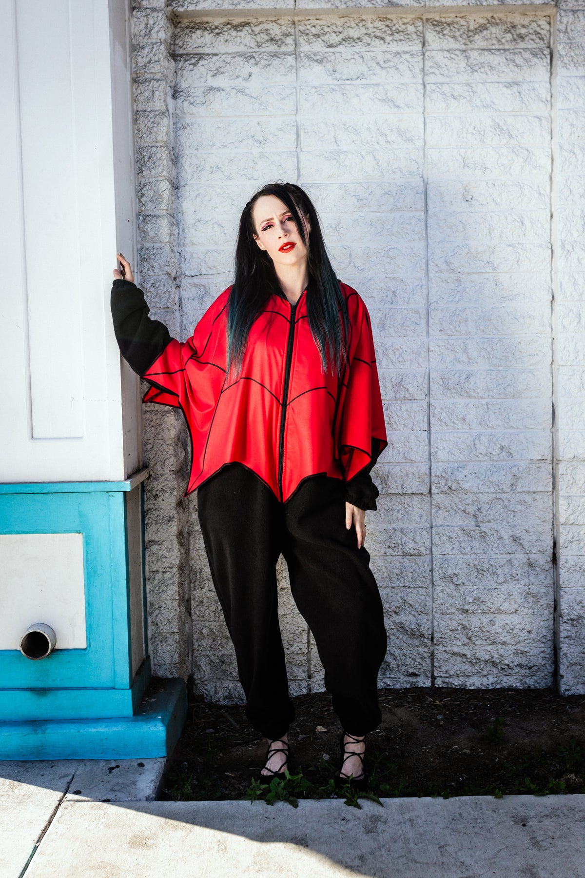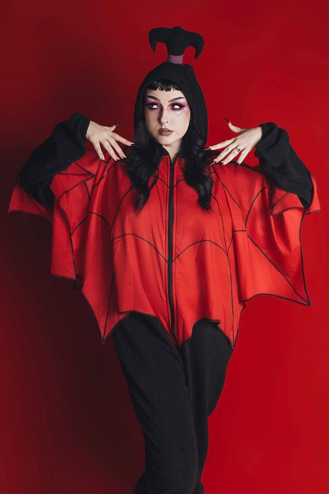 The standout feature of this onesie is the eye-catching, red spiderweb poncho, made from high-quality polyester. This adds a vibrant contrast to the black body, and captures Lydia's distinctive style. The body of the onesie is designed with practicality in mind, featuring a chunky, black plastic zipper and pockets that aare all cleverly concealed to maintain the sleek aesthetic.