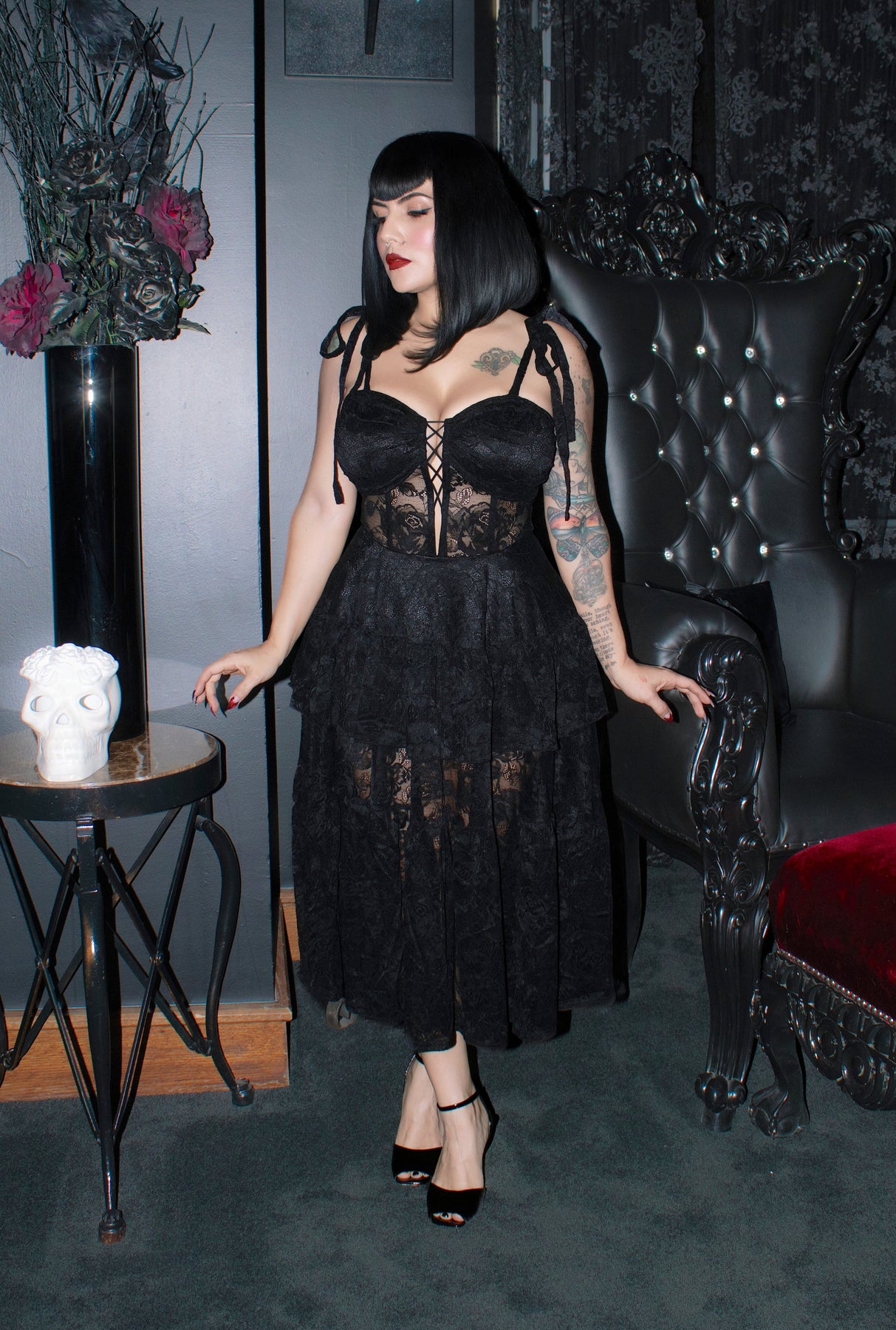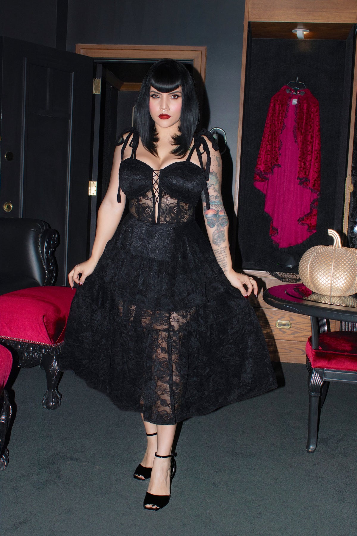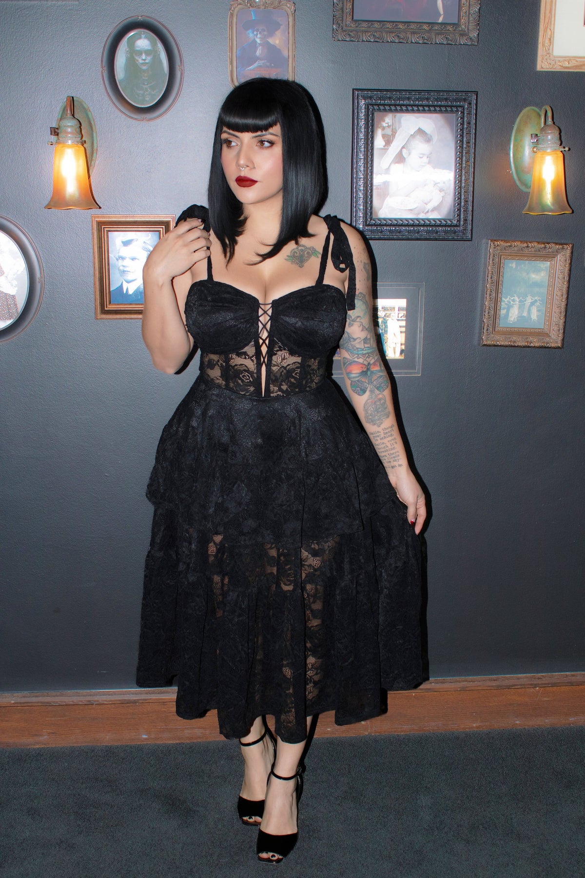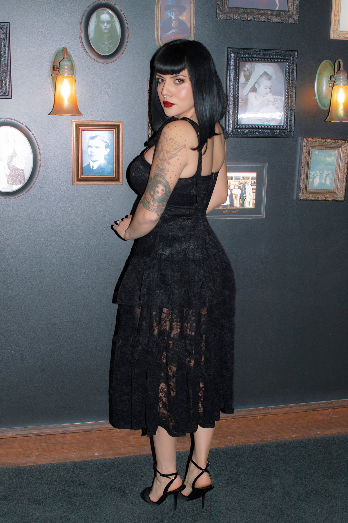 Delicate, daring, and undeniably bewitching—the Maila Dress is a love letter to dark romance and vintage gothic charm. Made from a soft poly elastane blend lace with a stretch poly satin lining. This dress offers 2 inches of comfortable fabric stretch while draping your figure in the most ethereal way. The bodice features ruched lace cups with a crisscross lace-up detail, leading the eye to adjustable shoulder ties trimmed in lace. A ruffled lace peplum cascades from the waist, adding volume and dimension before revealing the sheer lace skirt that artfully showcases the shorter lining beneath. Finished with a back zipper for ease, this piece feels like something straight from a midnight séance or an old-world cabaret.