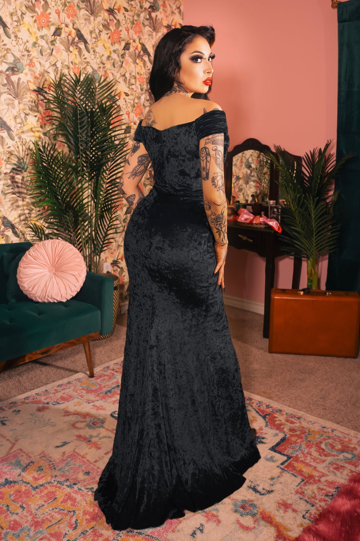 The Oozma Onyx Velvet Gown is a show-stopping piece that merges modern flair with classic Hollywood glamor. Made from luxurious, black stretch-velvet, this design features a structural bodice detail that evokes the iconic horns of Maleficent.