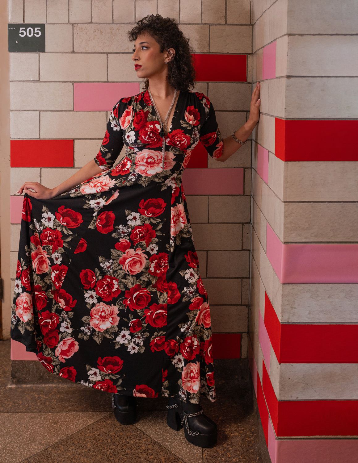 Our best-selling Raquel Maxi Dress is now available in this gorgeous red rose print knit! This ultra soft and stretchy silhouette has a magic waist-snatching effect, with a shirred plunging neckline and princess seams. The fabric is virtually unwrinkelable (is that a word? lol) and is perfect for all day wear, or wearing while traveling, or just any time you want to throw something on without being too fussy and still feeling like a million bucks!