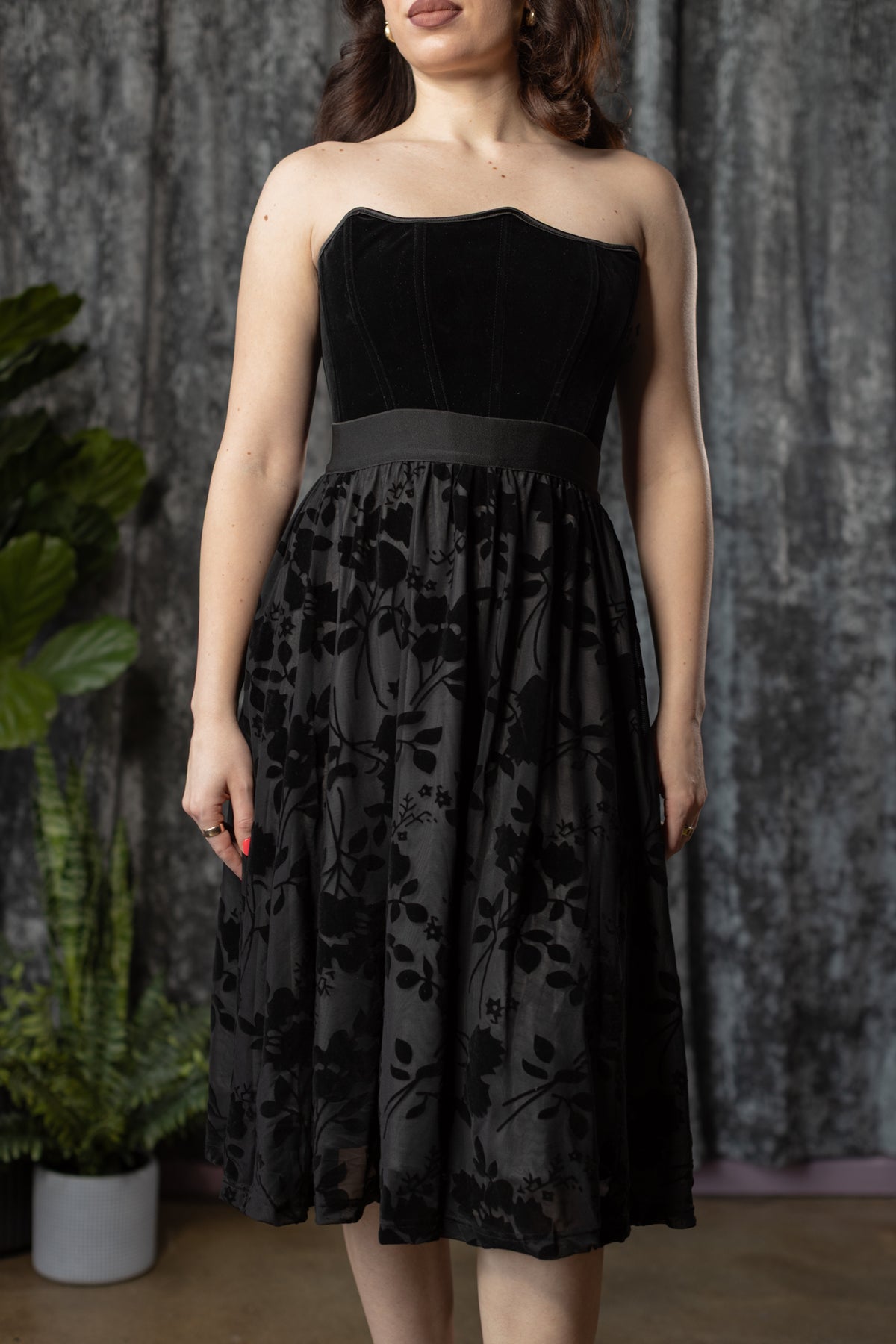 It features a super stretchy and curve hugging elastic waistband, stretchy sheer velvet flocked mesh skirt and with charcoal lining.