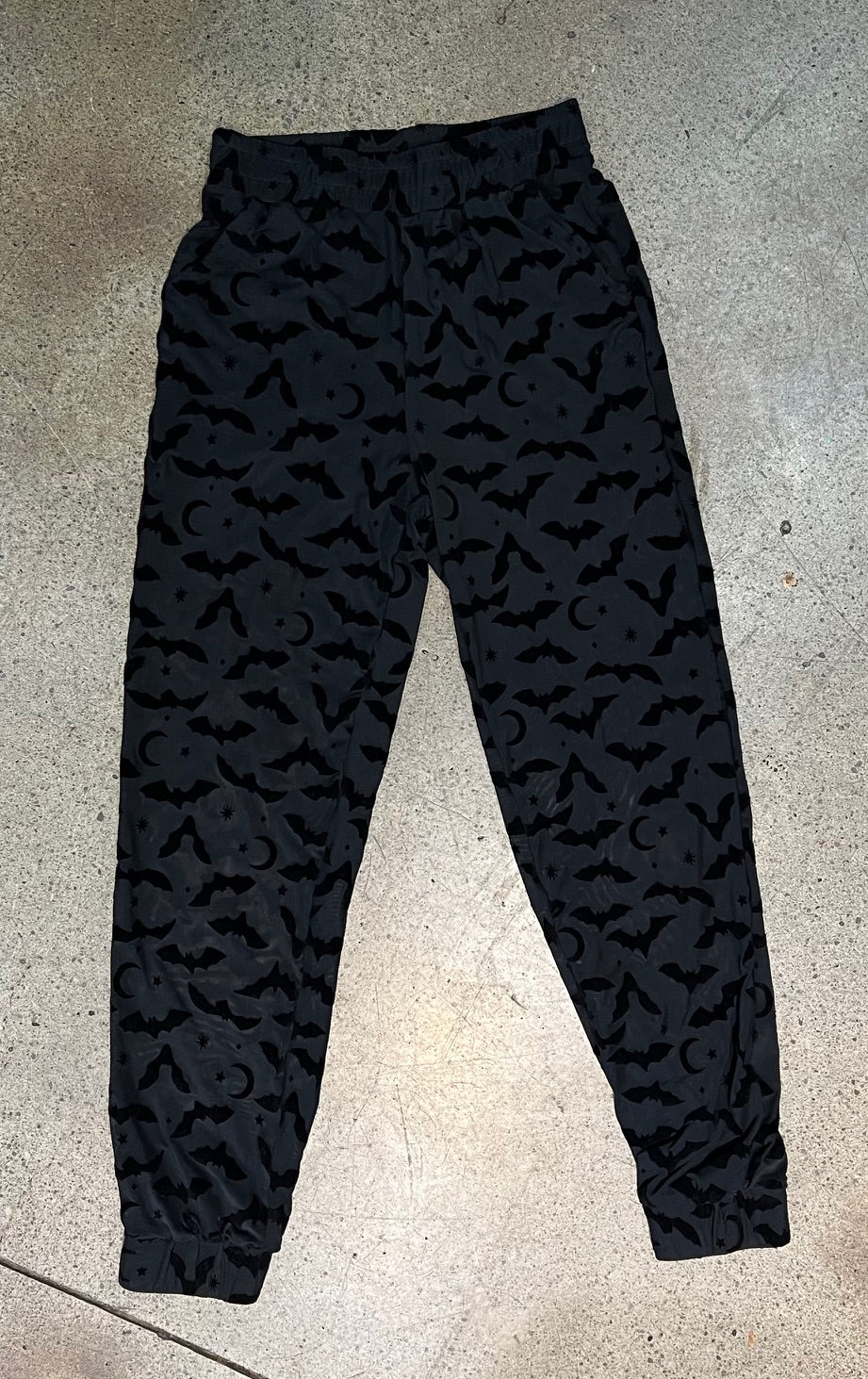 These track jackets and joggers are super stretchy and comfy! Sheer velvet flocked bat fabric!