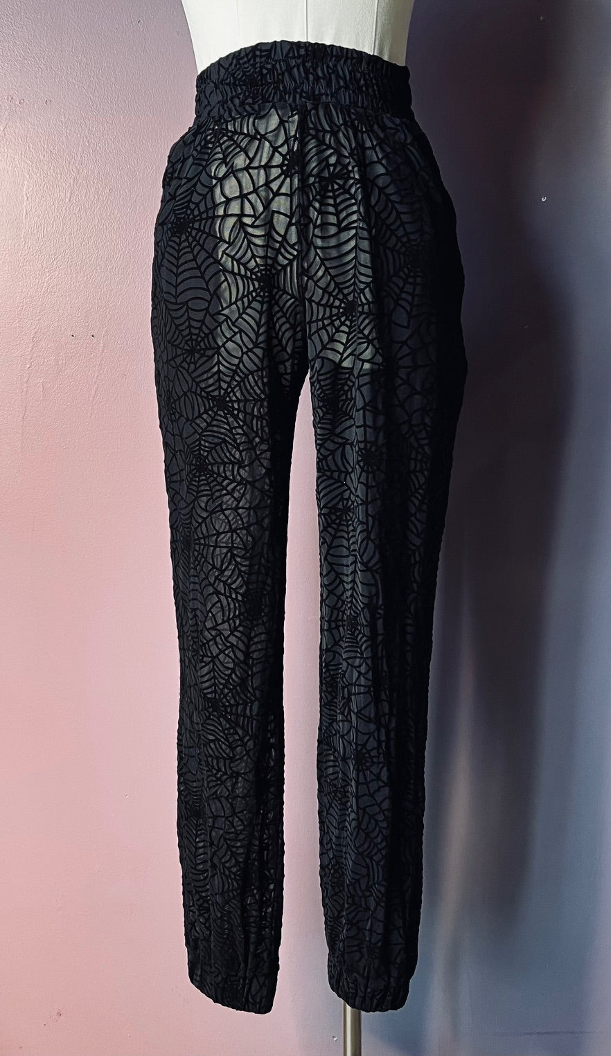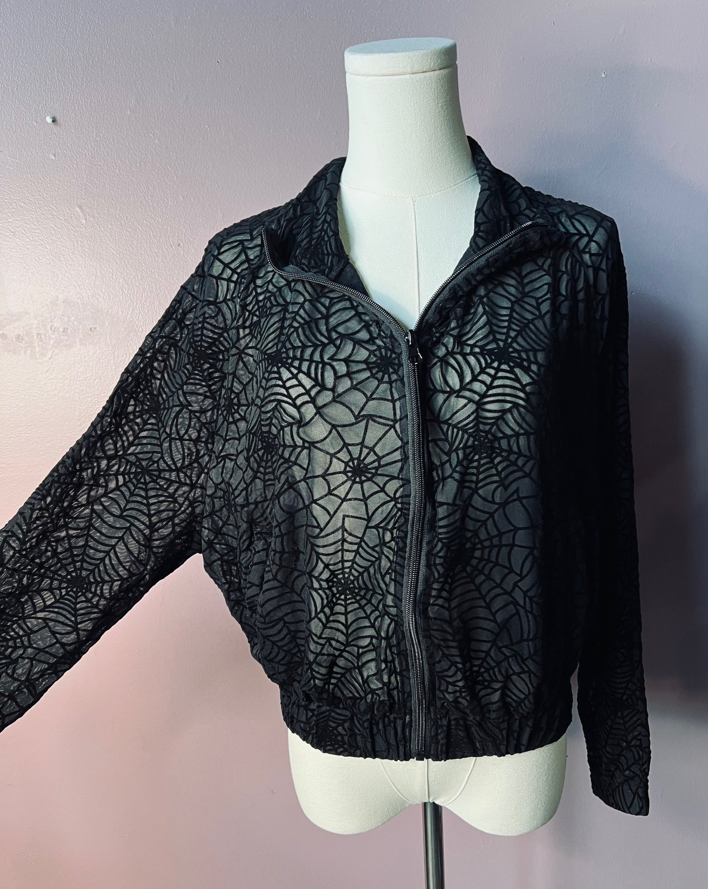 These track jackets and joggers are super stretchy and comfy! Sheer velvet flocked bat fabric!