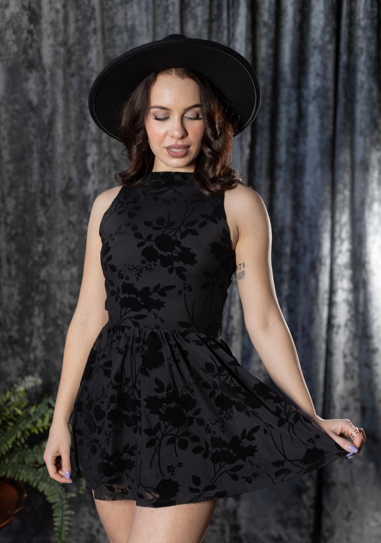 This gothic floral romper is designed as a mini dress with BUILT IN SHORTS, giving you the freedom to move without sacrificing silhouette or drama. The velvet flocked gothic florals add rich texture and depth, creating a look that’s equal parts delicate and dangerous.